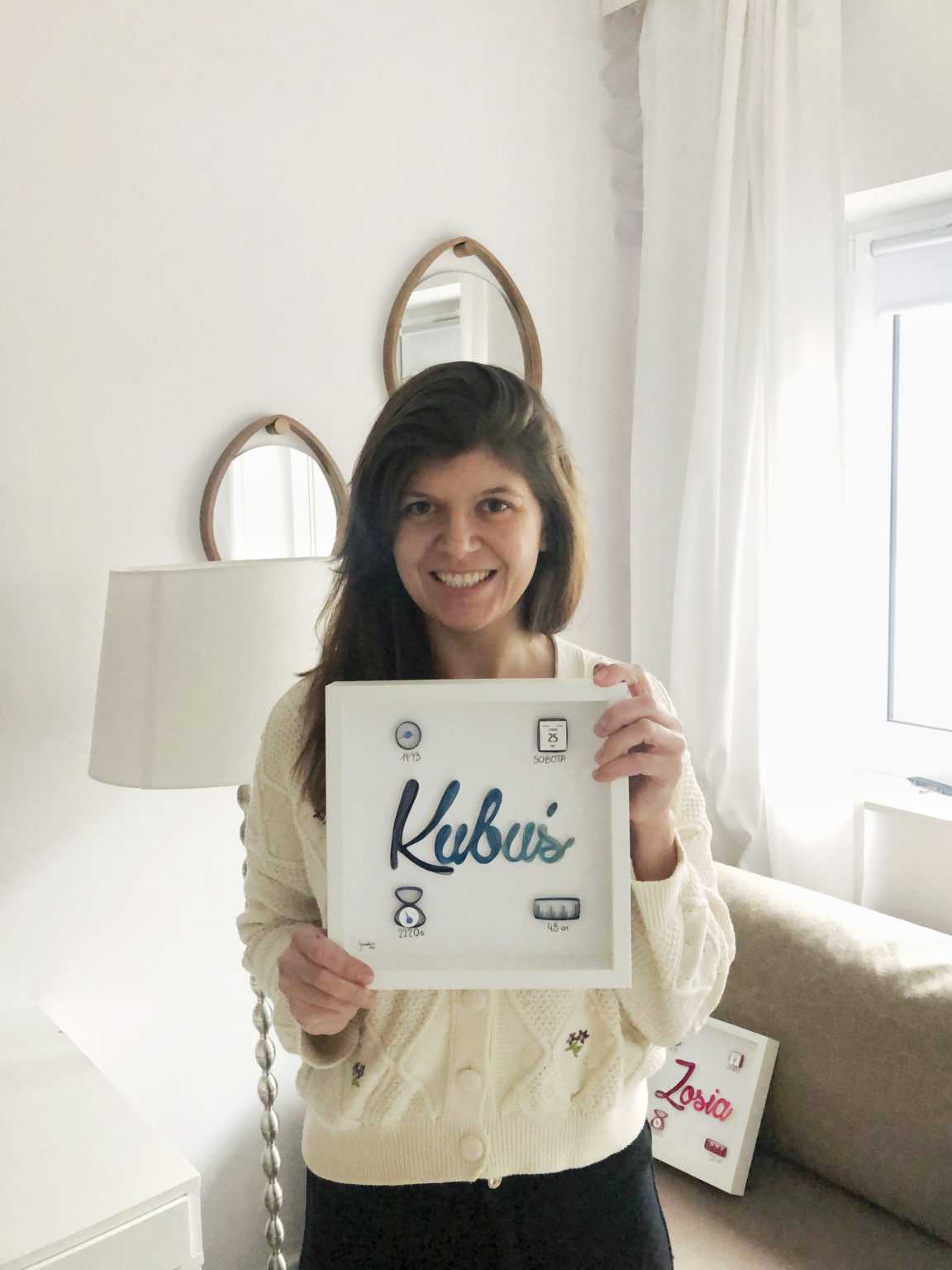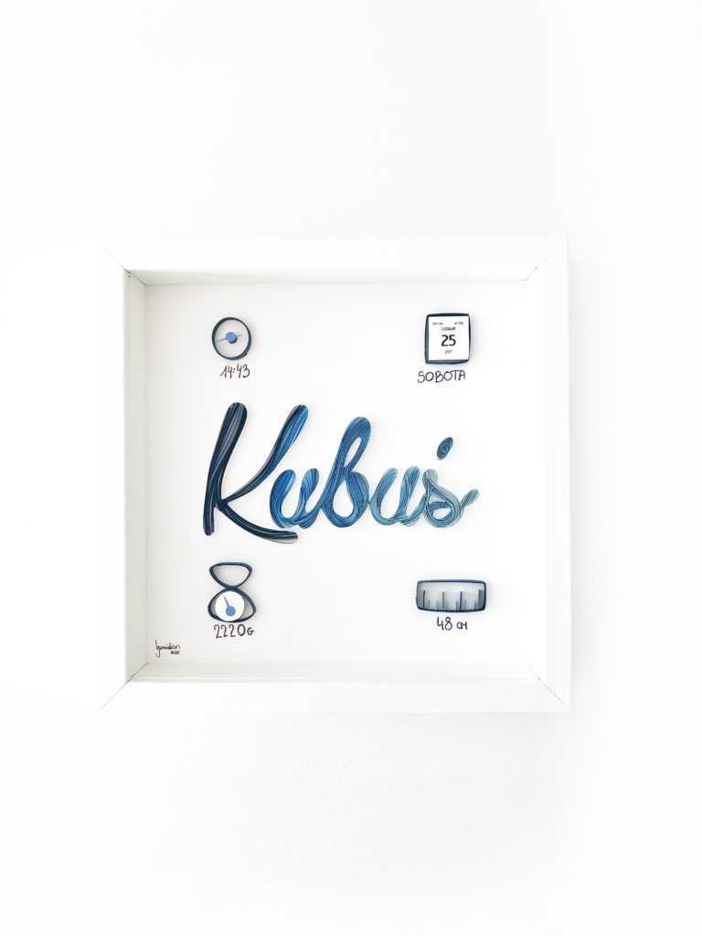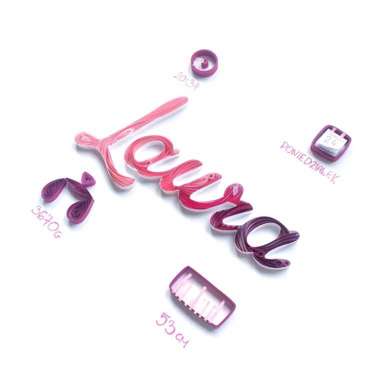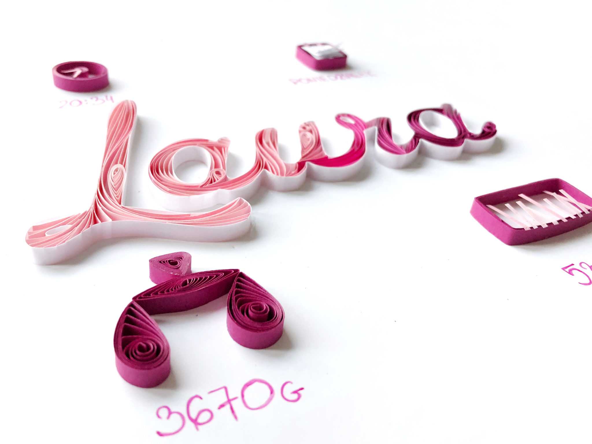 Spersonalizowany obrazek z dowolnym napisem i parametrami dziecka z możliwością indywidualnego dopasowania kolorystyki ozdób, tła i ramki. Oryginale trójwymiarowe obrazki to oryginalny prezent na narodziny dziecka, chrzciny lub urodziny. Przygotowywany w ustalonych barwach będzie pasowała do różnych wnętrz.